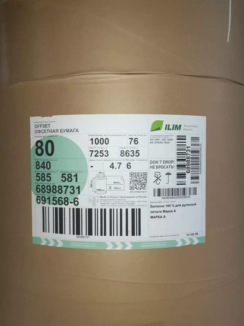 Бумага офсетная в рулонах, 80 г/м2, г.Коряжма (Россия)